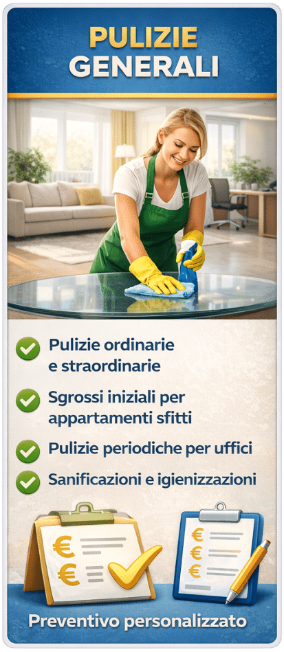 - Zone esterne (se presenti): pulizia di terrazzi, balconi e aree esterne interessate.